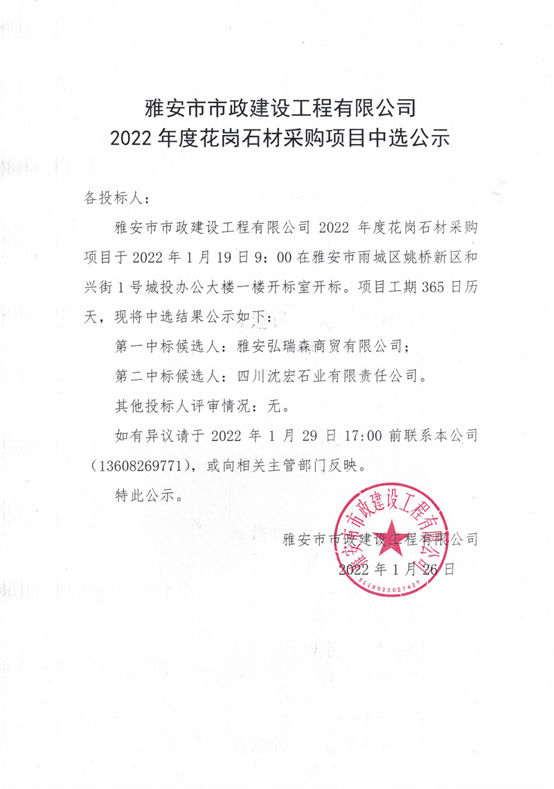 雅安市市政建設(shè)工程有限公司2022年度花崗石材采購(gòu)項(xiàng)目中選公示