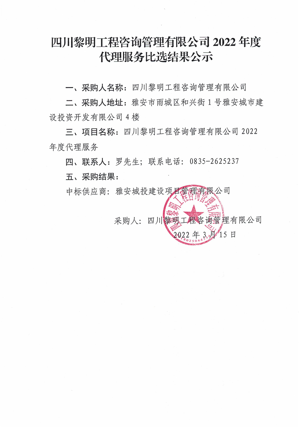 四川黎明工程咨詢(xún)管理有限公司2022年度代理服務(wù)必選結(jié)果公示