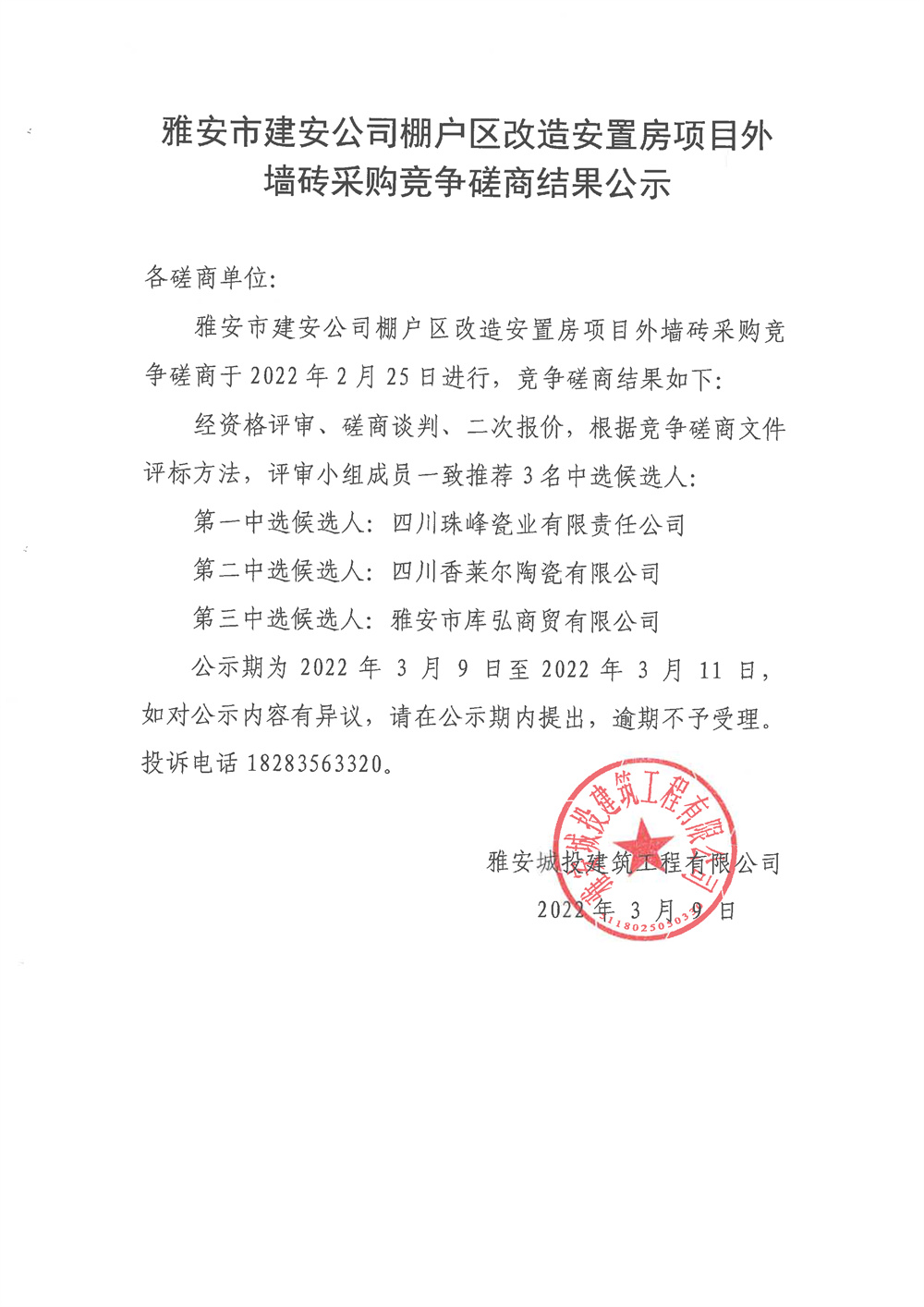 雅安市建安公司棚戶區(qū)改造安置房項(xiàng)目外墻磚采購競爭磋商結(jié)果公示