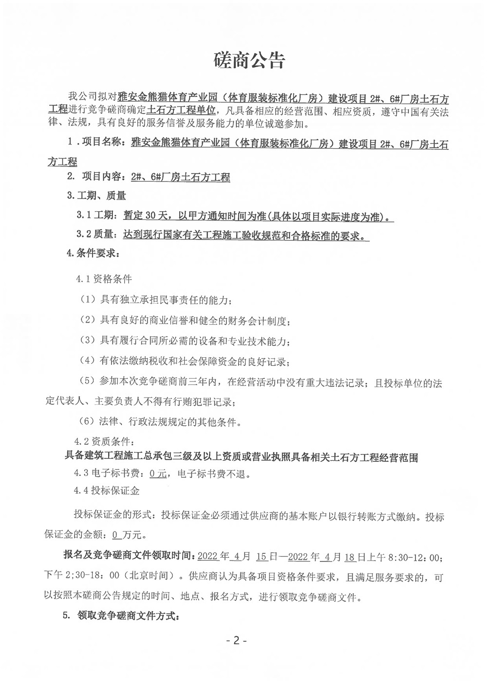雅安金熊貓?bào)w育產(chǎn)業(yè)園(體育服裝標(biāo)準(zhǔn)化廠(chǎng)房)建設(shè)項(xiàng)目2#、6#廠(chǎng)房土石方工程磋商公告