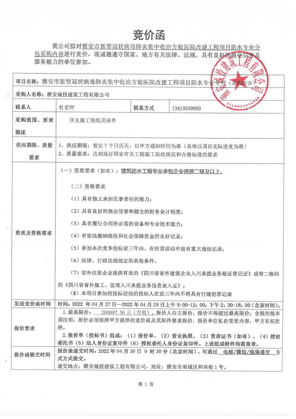 雅安市新型冠狀病毒肺炎集中收治方艙醫(yī)院改建工程項(xiàng)目防水專業(yè)分包采購(gòu)