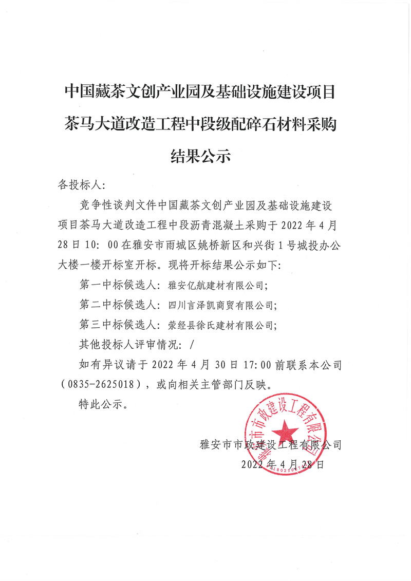 中國藏茶文創(chuàng)產(chǎn)業(yè)園及基礎(chǔ)設(shè)施建設(shè)項目茶馬大道改造工程中段級配碎石材料采購結(jié)果公示