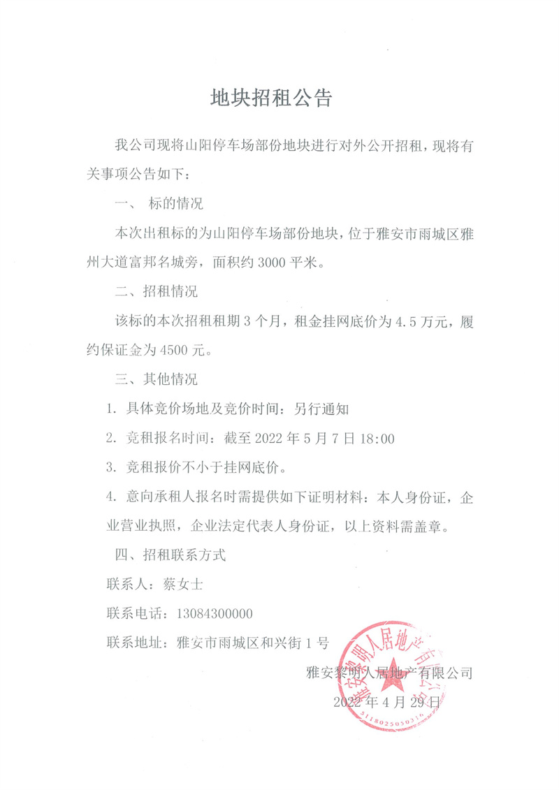 黎明人居公司山陽(yáng)停車場(chǎng)部分地塊招租公告