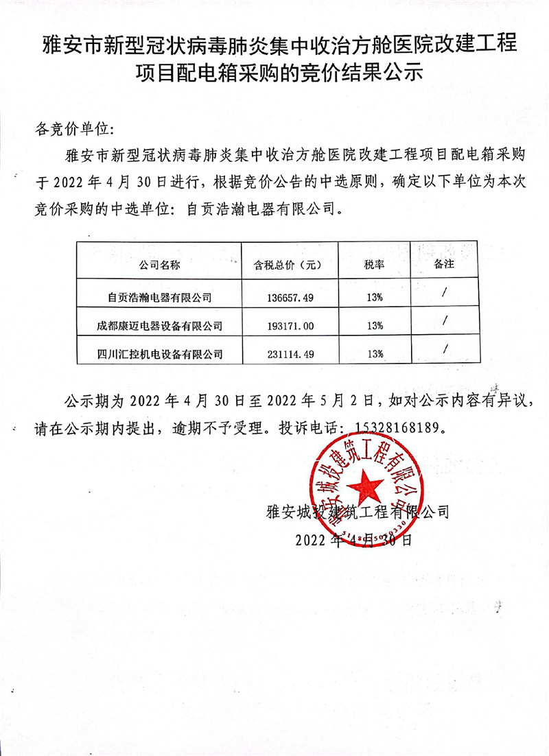 雅安市新型冠狀病毒肺炎集中收治方艙醫(yī)院改建工程項目配電箱采購的競價結(jié)果公示