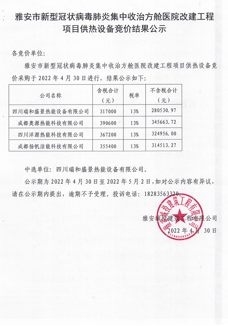 雅安市新型冠狀病毒肺炎集中收治方艙醫(yī)院改建工程項目供熱設備競價結果公示