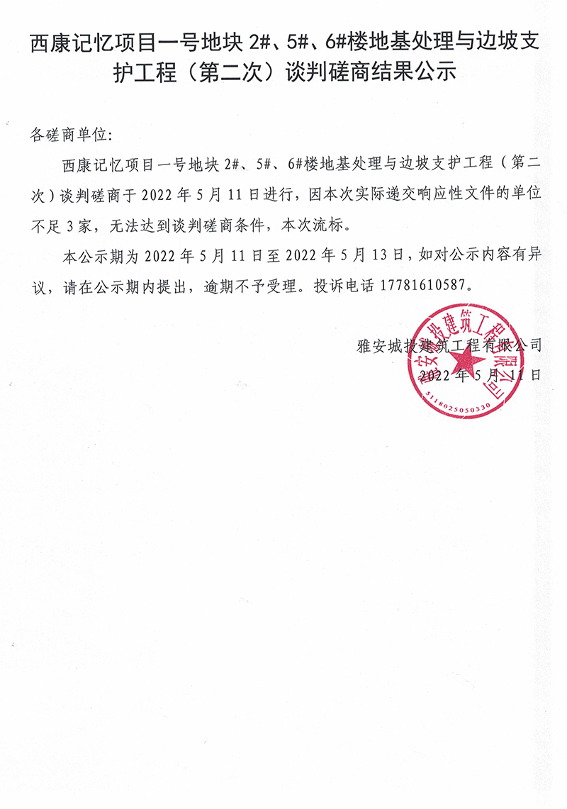 西康記憶項目一號地塊2#、5#、6#樓地基處理與邊坡支護工程(第二次)談判磋商結(jié)果公示