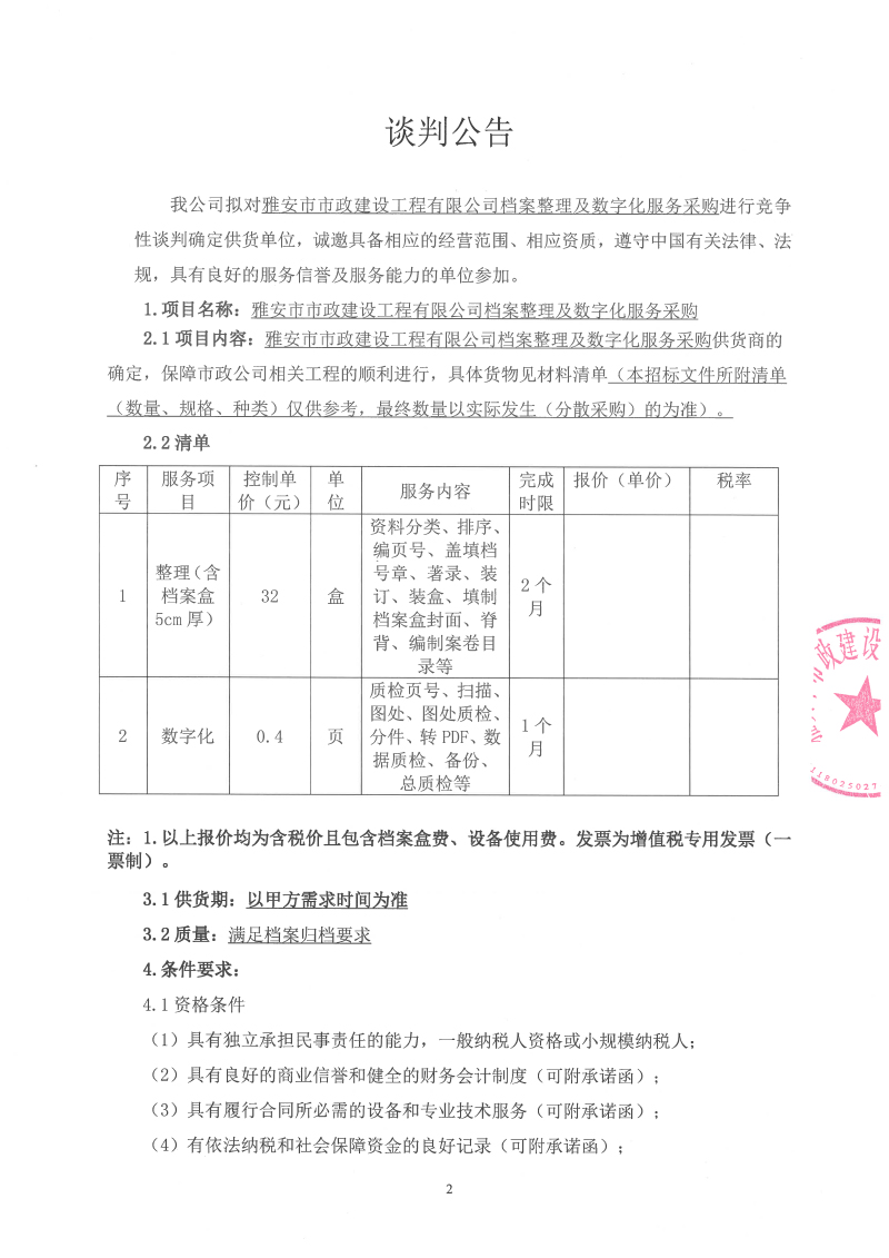 雅安市市政建設(shè)工程有限公司檔案整理及數(shù)字化服務(wù)采購(gòu)競(jìng)爭(zhēng)性談判公告
