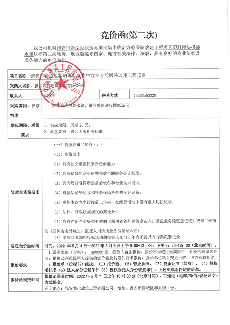 雅安市新型冠狀病毒肺炎集中收治方艙醫(yī)院改建工程項(xiàng)目塑料模塊拼裝水箱競價(jià)函(第二次)