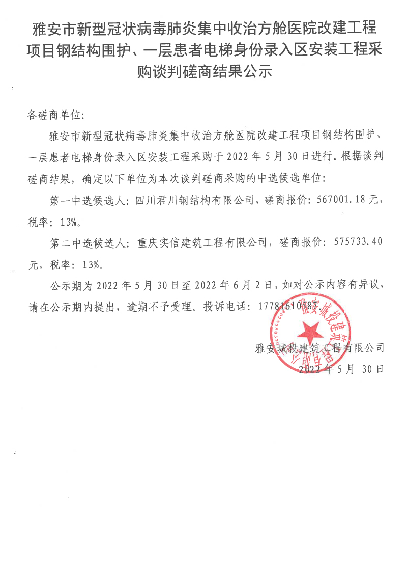 雅安市新型冠狀病毒肺炎集中收治方艙醫(yī)院改建工程項目鋼結構圍護、一層患者電梯身份錄入區(qū)安裝工程采購談判磋商結果公示