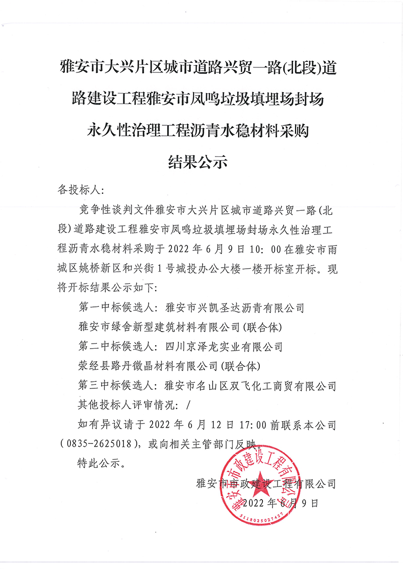 雅安市大興片區(qū)城市道路興貿(mào)一路(北段)道路建設工程雅安市鳳鳴垃圾填埋場封場永久性治理工程瀝青水穩(wěn)材料采購結果公示