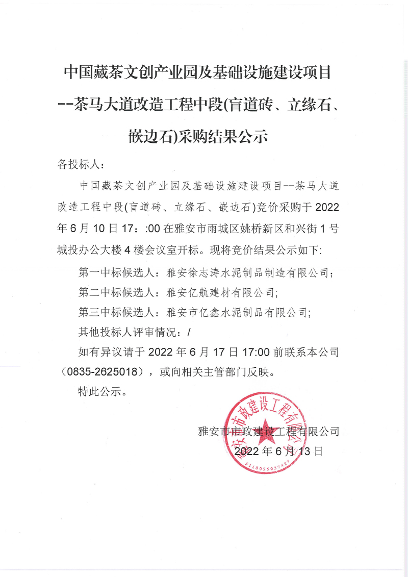 中國(guó)藏茶文創(chuàng)產(chǎn)業(yè)園及基礎(chǔ)設(shè)施建設(shè)項(xiàng) 茶馬大道改造工程中段盲道磚、混凝土嵌邊石采購(gòu)結(jié)果公示