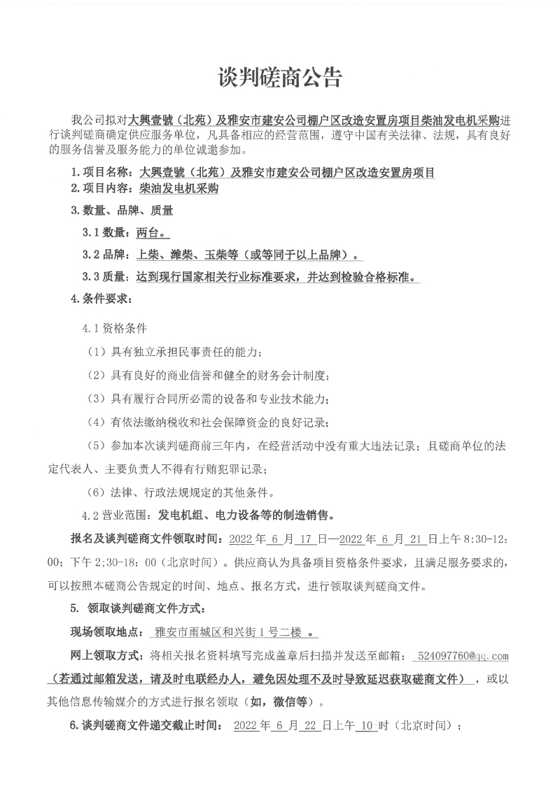 大興壹號(hào)(北苑)及雅安市建安公司棚戶區(qū)改造安置房項(xiàng)目柴油發(fā)電機(jī)采購談判磋商公告