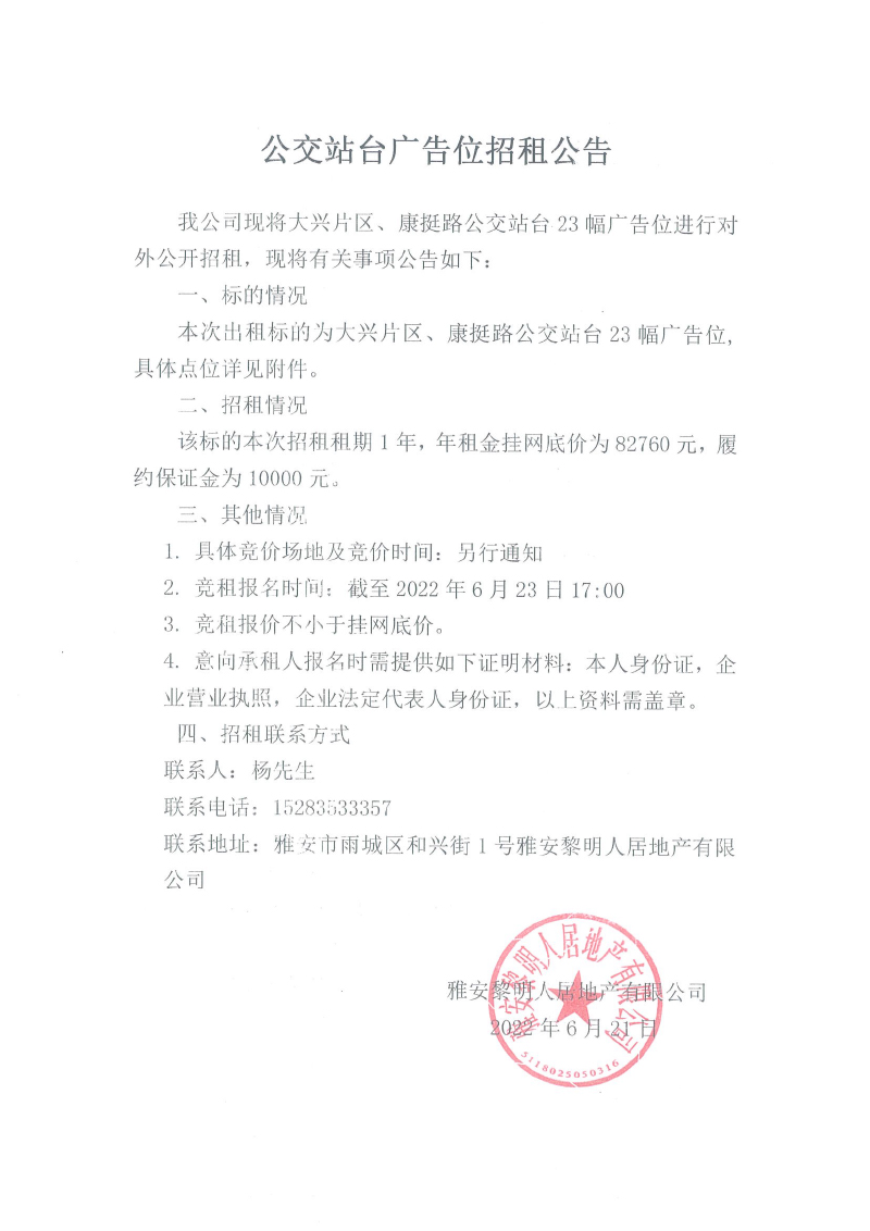 大興片區(qū)、康挺路23幅公交站臺廣告招租公告