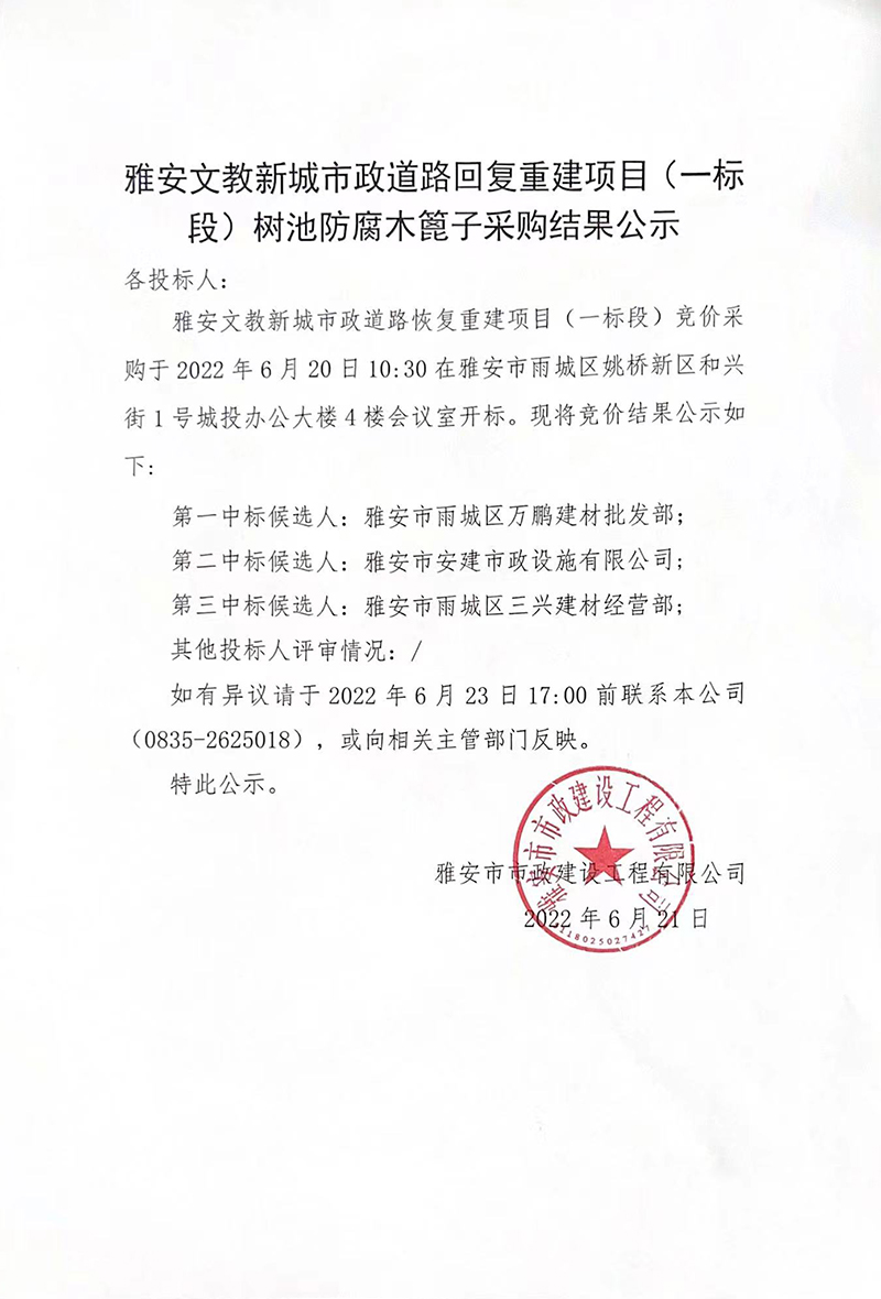 雅安市文教新城市政道路恢復(fù) 重建項(xiàng)目工程(一標(biāo)段)樹(shù)池防腐木篦子采購(gòu)結(jié)果公示