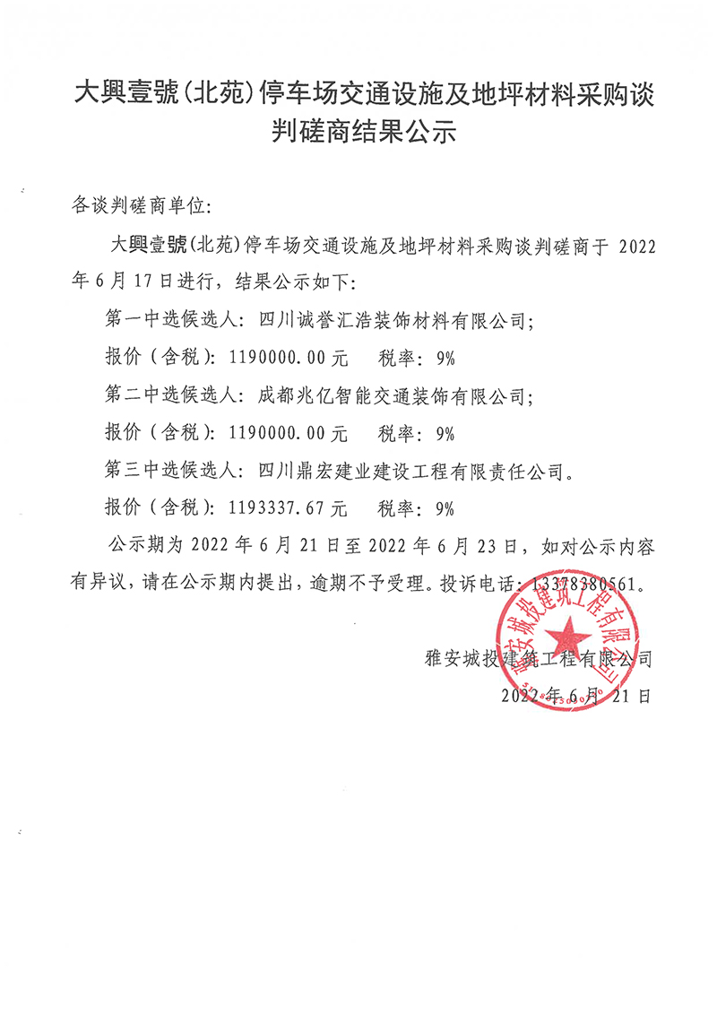 大興壹號(北苑)停車場交通設(shè)施及地坪材料采購談判磋商結(jié)果公示