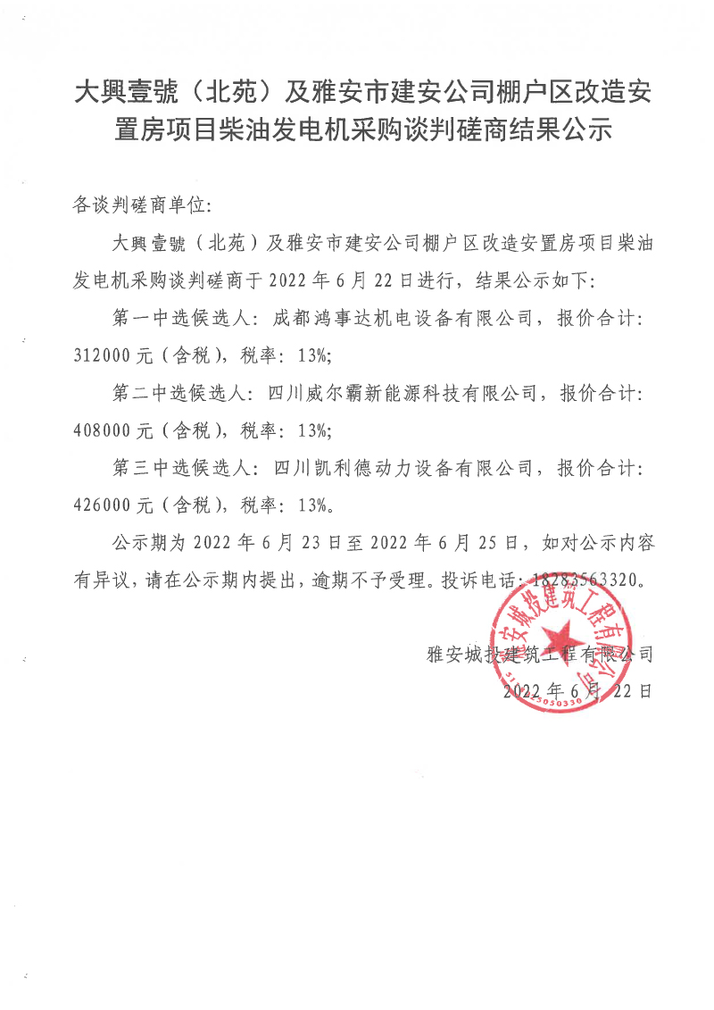 大興壹號(北苑)及雅安市建安公司棚戶區(qū)改造安置房項目柴油發(fā)電機采購談判磋商結(jié)果公示
