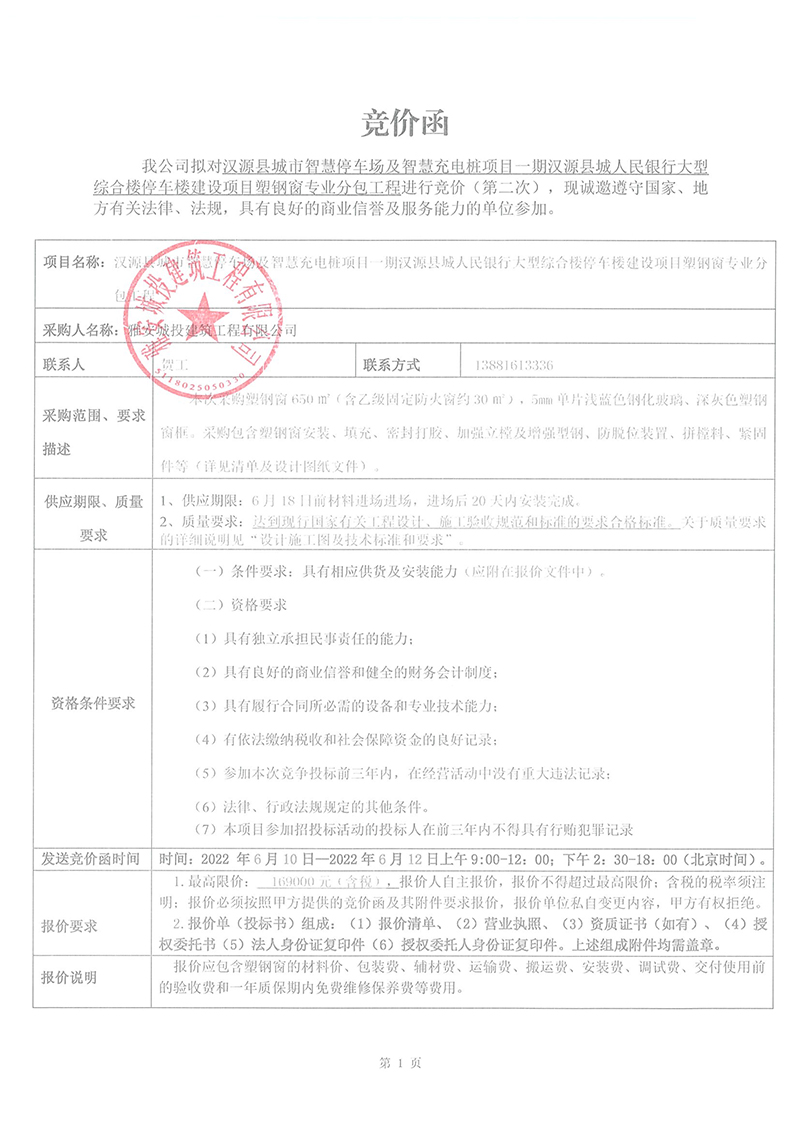 漢源縣城市智慧停車場(chǎng)及智慧充電樁項(xiàng)目一期漢源縣城人民銀行大型綜合樓停車樓建設(shè)項(xiàng)目塑鋼窗專業(yè)分包工程競(jìng)價(jià)采購(gòu)競(jìng)價(jià)公告