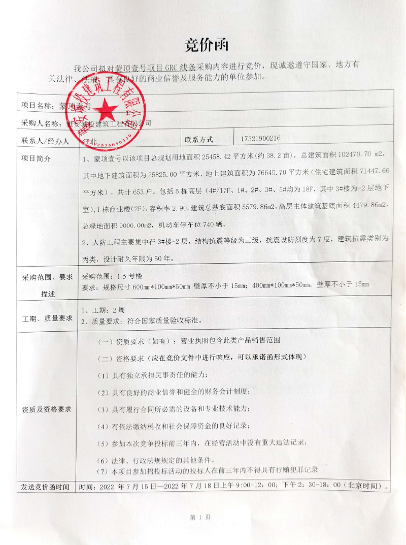 蒙頂壹號項(xiàng)目GRC線條采購競爭公告