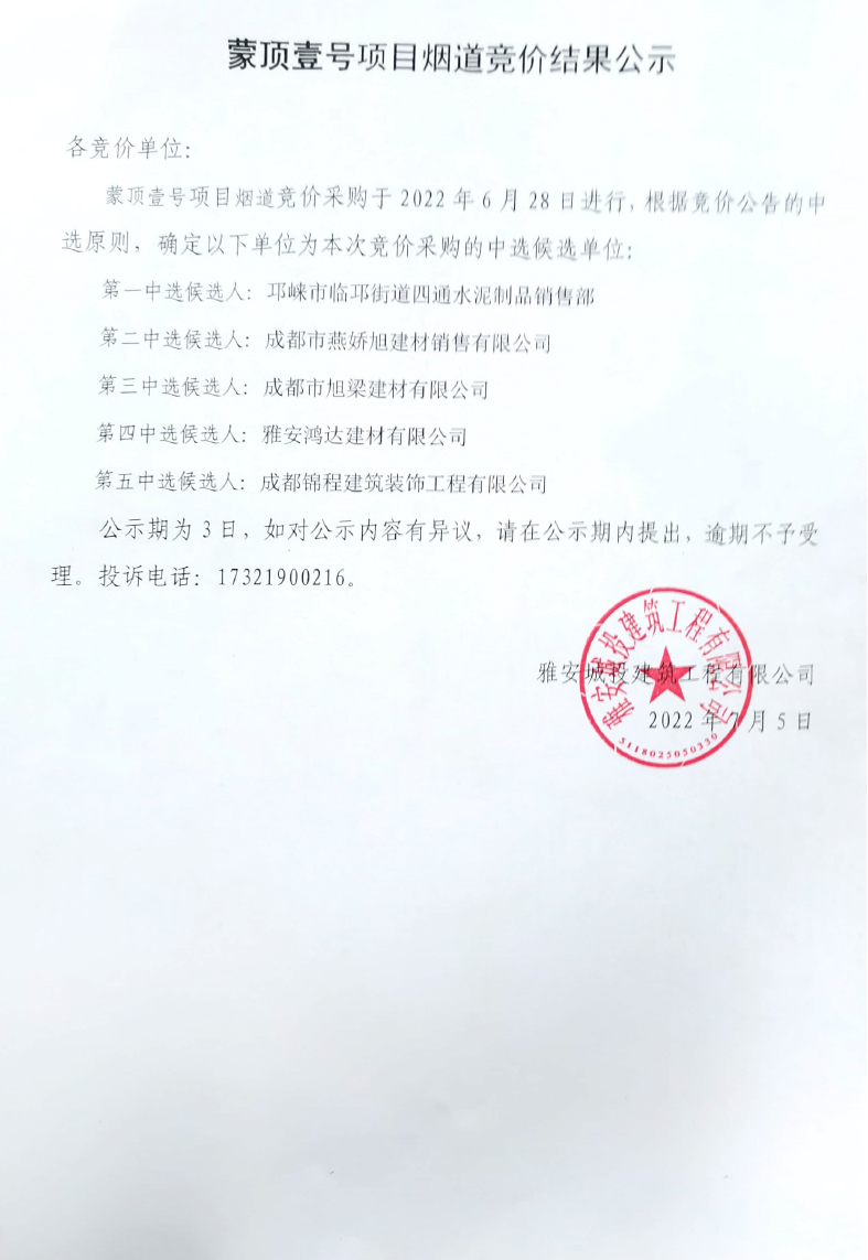蒙頂壹號項目煙道采購競價結果公示