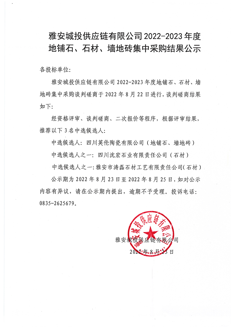 雅安城投供應鏈有限公司2022-2023年度地鋪石、石材、墻地磚集中采購結果公示