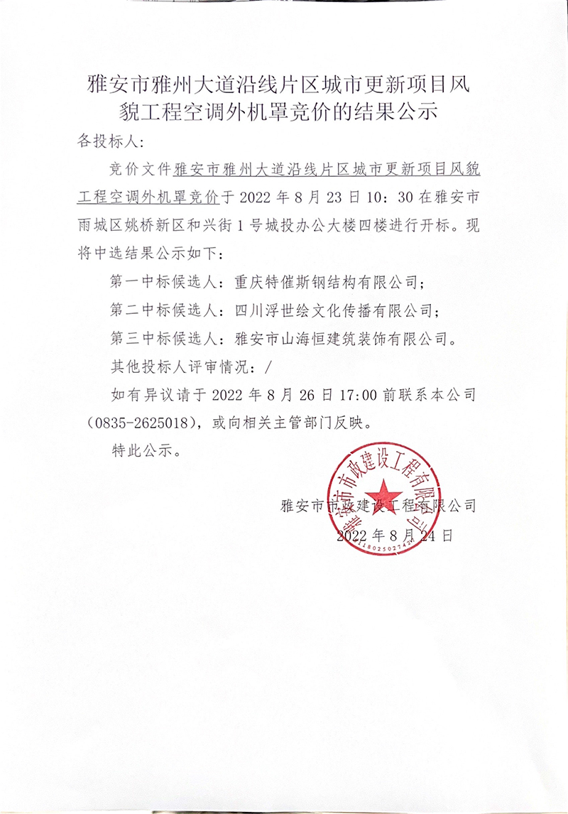 雅安市雅州大道沿線片區(qū)城市更新項目風貌工程空調(diào)外機罩競價的結(jié)果公示