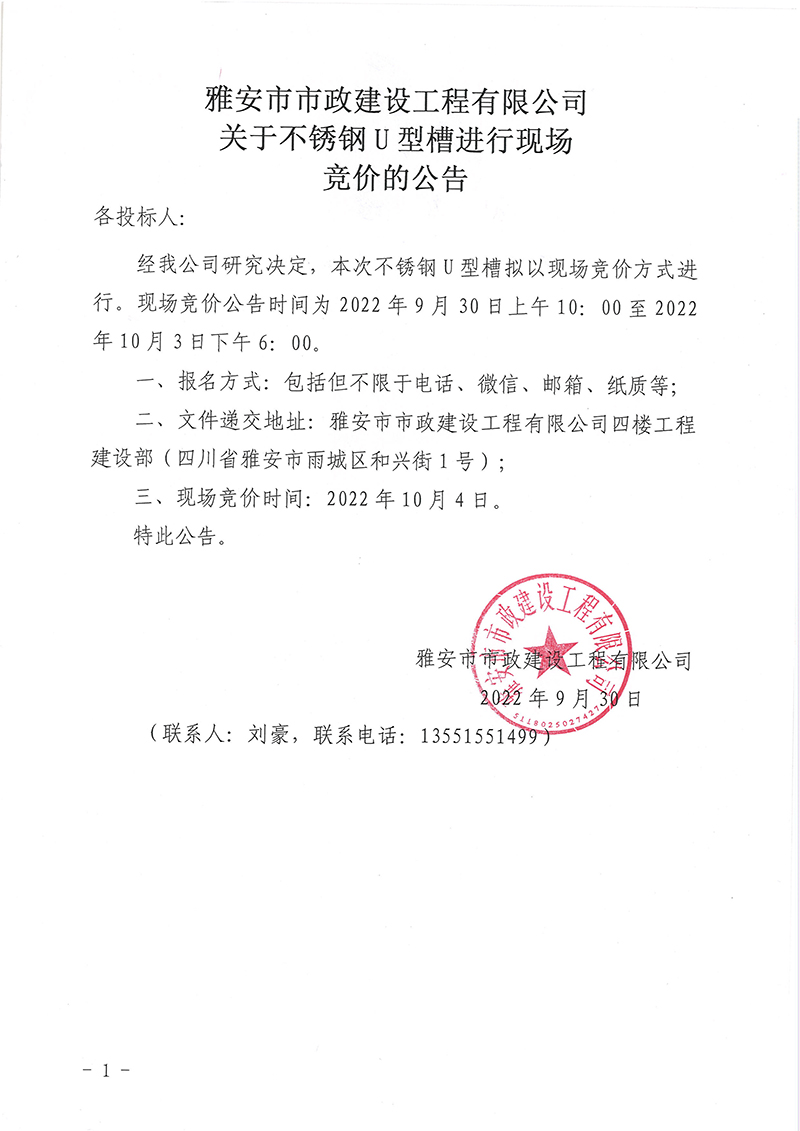 關于不銹鋼U型槽進行現(xiàn)場競價的公告