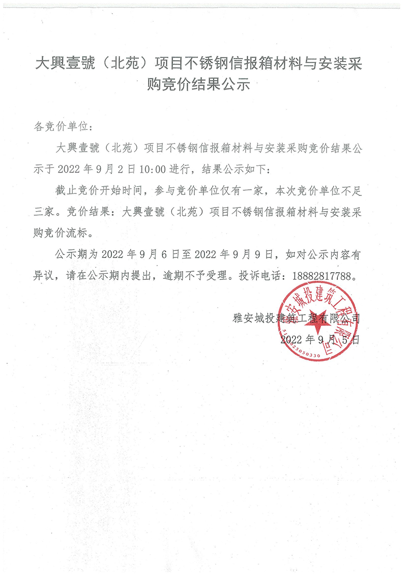 大興壹號(北苑)項(xiàng)目不銹鋼信報(bào)箱材料與安裝采購競價(jià)結(jié)果公示
