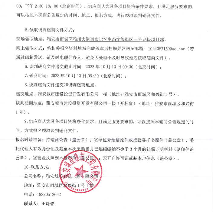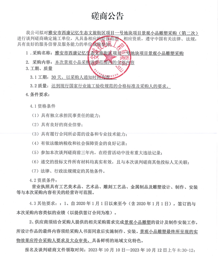 雅安市西康記憶生態(tài)文旅街區(qū)項(xiàng)目一號(hào)地塊項(xiàng)目景觀小品雕塑采購(gòu)(第二次)談判磋商公告