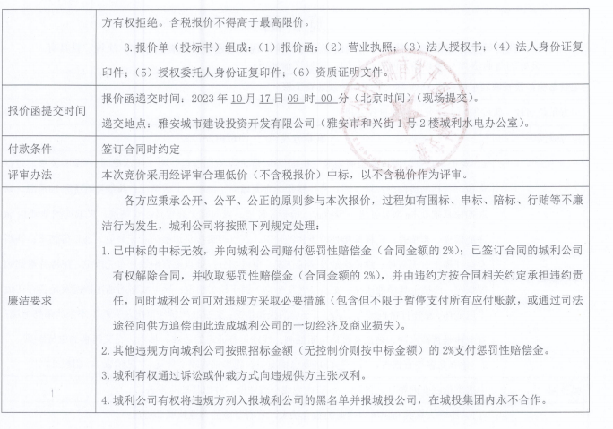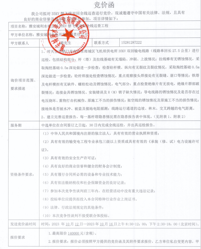 雅安城利水電公司35KV禁飛線雙回全線巡查工程競價公告