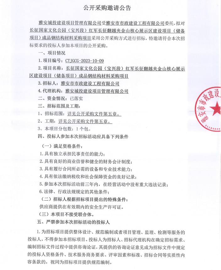 長(zhǎng)征國(guó)家文化公園(寶興段)紅軍長(zhǎng)征翻越夾金山核心展示區(qū)建設(shè)項(xiàng)目(儲(chǔ)備項(xiàng)目)成品鋼結(jié)構(gòu)材料采購(gòu)項(xiàng)目公開采購(gòu)邀請(qǐng)公告