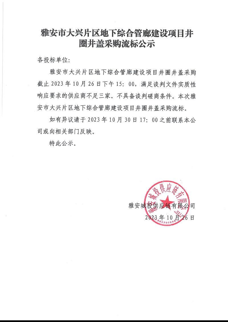 雅安市大興片區(qū)地下綜合管廊建設(shè)項(xiàng)目井圈井蓋采購(gòu)流標(biāo)公示