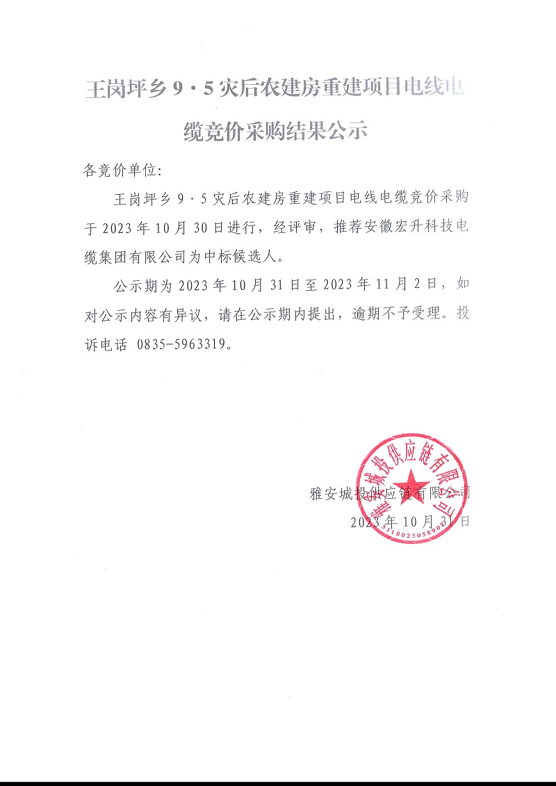 王崗坪鄉(xiāng)9.5災(zāi)后農(nóng)建房重建項(xiàng)目電線(xiàn)電纜競(jìng)價(jià)采購(gòu)結(jié)果公示