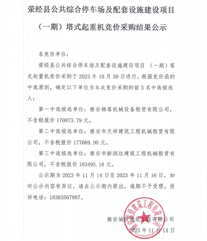滎經(jīng)縣公共綜合停車場及配套設(shè)施建設(shè)項(xiàng)目(一期)塔式起重機(jī)競價(jià)采購結(jié)果公示