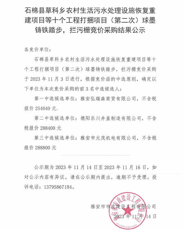 石棉縣草科鄉(xiāng)農(nóng)村生活污水處理設(shè)施恢復(fù)重建項(xiàng)目等十個(gè)工程打捆項(xiàng)目(第二次)球墨鑄鐵踏步,攔污柵競價(jià)采購結(jié)果公示