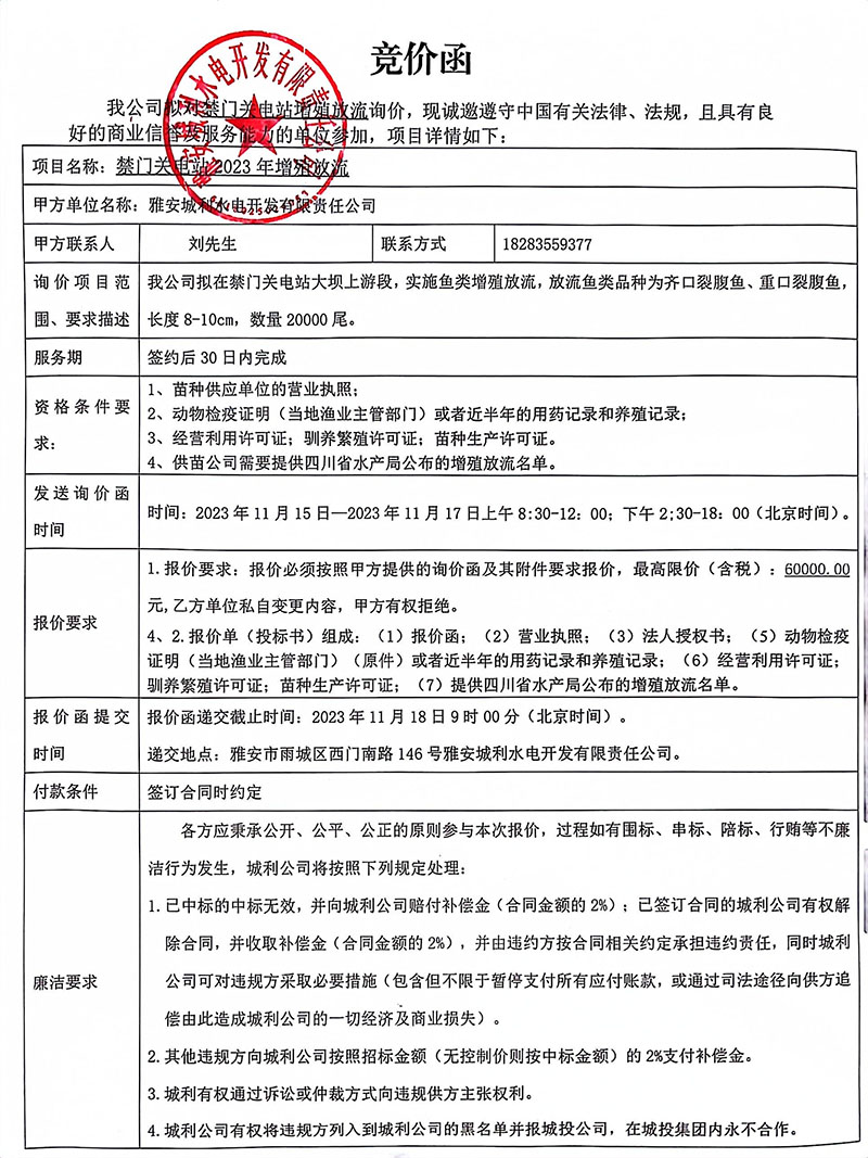 禁門關(guān)電站2023年增殖放流競(jìng)價(jià)公告