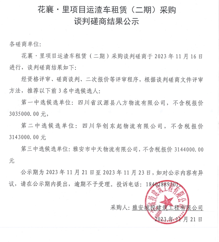 花襄·里項目運渣車租賃(二期)采購談判磋商結(jié)果公示