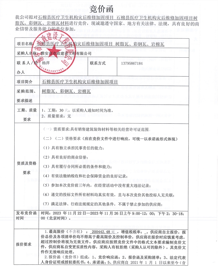 石棉縣醫(yī)療衛(wèi)生機構(gòu)災后維修加固改造項目采購樹脂瓦、彩鋼瓦、巖棉瓦材料競價公告