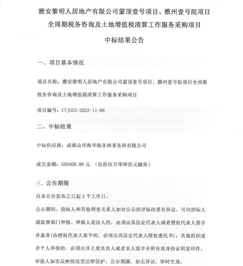 雅安黎明人居地產有限公司蒙頂壹號項目、雅州壹號院項目全周期稅務咨詢及土地增值稅清算工作服務采購項目中標結果公告