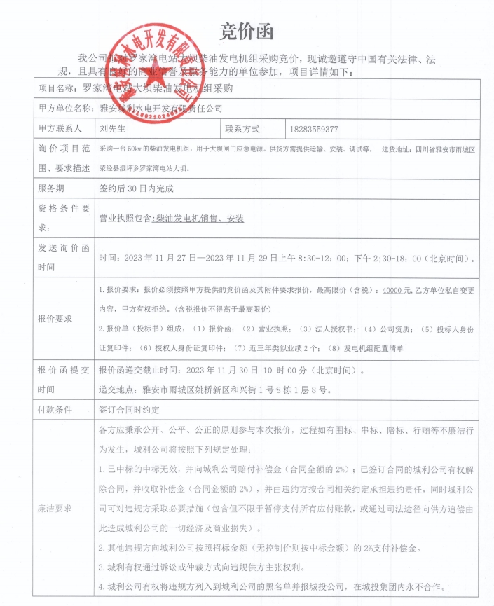 羅家灣電站大壩柴油發(fā)電機(jī)組采購競價(jià)公告