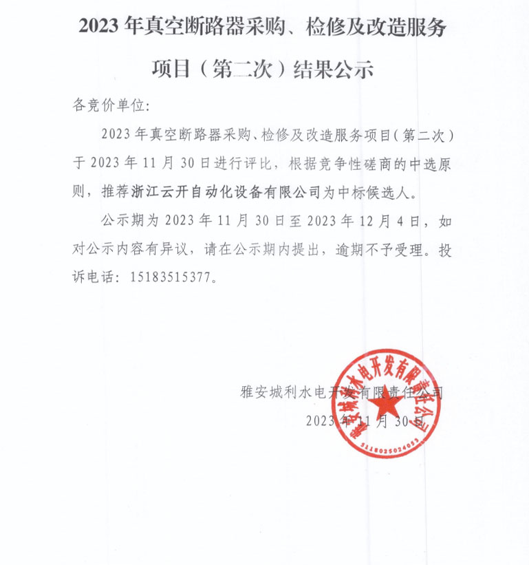 2023年真空斷路器采購、檢修及改造服務項目(第二次)結(jié)果公示