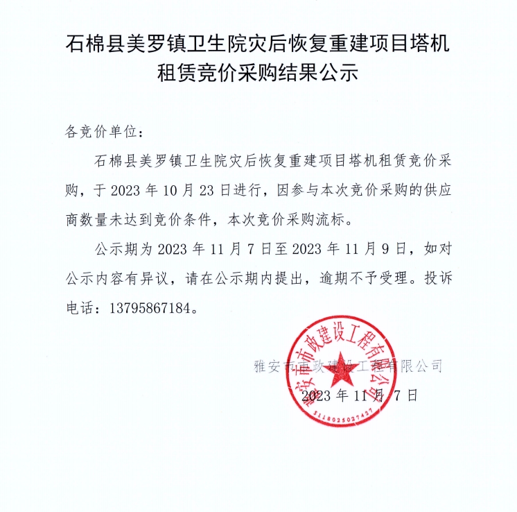 石棉縣美羅鎮(zhèn)衛(wèi)生院災(zāi)后恢復(fù)重建項(xiàng)目塔機(jī)租賃競(jìng)價(jià)采購(gòu)結(jié)果公示