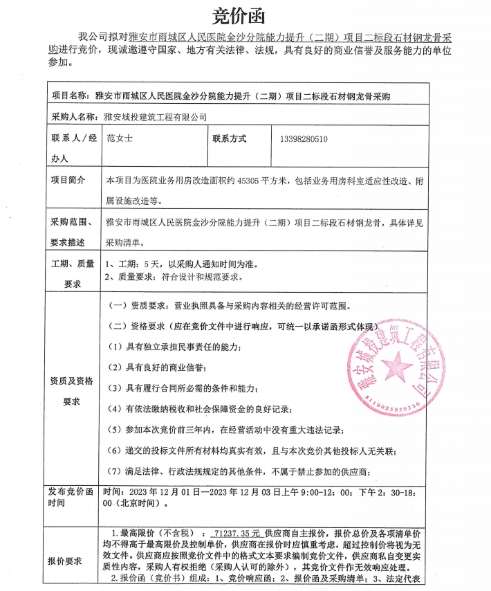 雅安市雨城區(qū)人民醫(yī)院金沙分院能力提升(二期)項(xiàng)目二標(biāo)段石材鋼龍骨采購(gòu)競(jìng)價(jià)公告