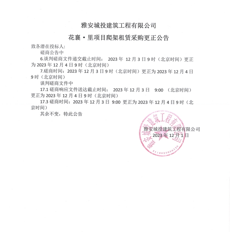雅安城投建筑工程有限公司花襄·里項(xiàng)目爬架租賃采購(gòu)更正公告