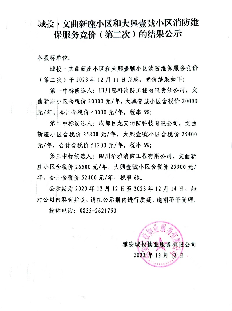 城投·文曲新座小區(qū)和大興壹號小區(qū)消防維保服務(wù)競價(jià)(第二次)的結(jié)果公示