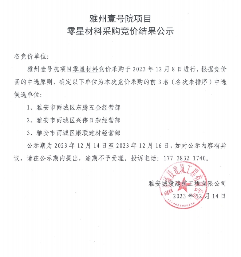 雅州壹號(hào)院項(xiàng)目零星材料采購(gòu)競(jìng)價(jià)結(jié)果公示