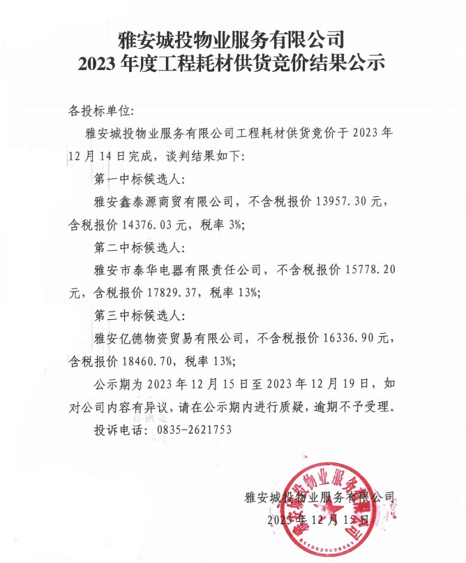 雅安城投物業(yè)服務有限公司2023年度工程耗材供貨競價結果公示