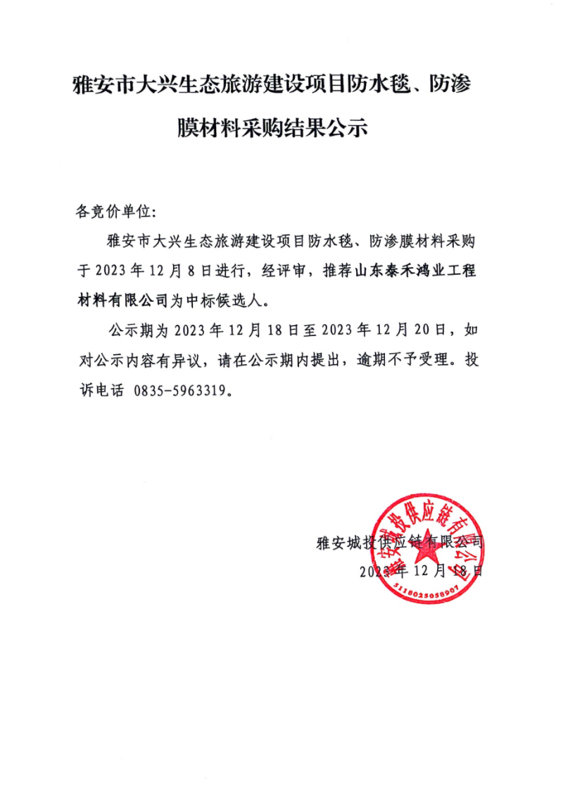 雅安市大興生態(tài)旅游建設項目防水毯、防滲膜材料采購結(jié)果公示