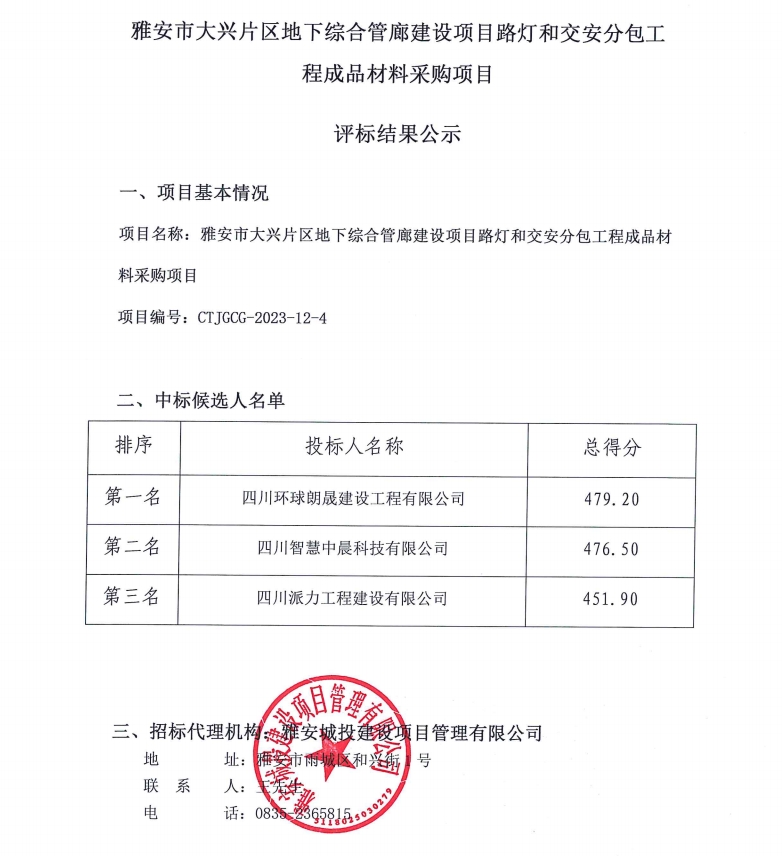 雅安市大興片區(qū)地下綜合管廊建設(shè)項目路燈和交安分包工程成品材料采購項目評標結(jié)果公示