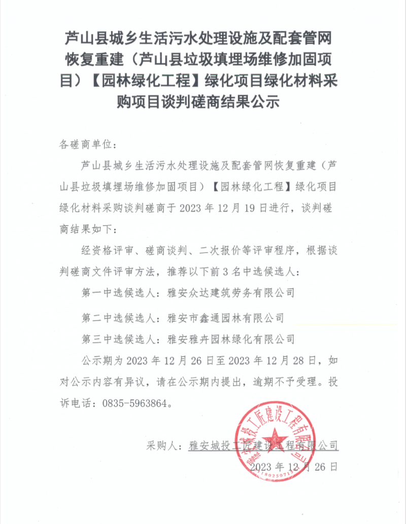蘆山縣城鄉(xiāng)生活污水處理設(shè)施及配套管網(wǎng)恢復(fù)重建(蘆山縣垃圾填埋場維修加固項目)【園林綠化工程】綠化項目綠化材料采購項目談判磋商結(jié)果公示