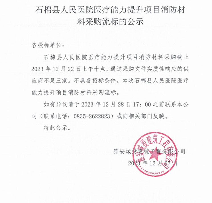 石棉縣人民醫(yī)院醫(yī)療能力提升項目消防材料采購流標的公示
